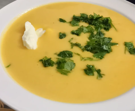 Gör så här: Skala och skär pumpan i tärningar. Skala och hacka löken. Fräs löken i smör i en gryta. Tillsätt pumpa, mjölk och buljongtärningarna. Låt soppan koka i ca 10 minuter. Mixa soppan och rör i hälften av crème fraiche. Smaksätt med lime, sambal oelek och ev salt. Låt soppan koka upp, servera med en klick crème fraiche och färsk koriander.