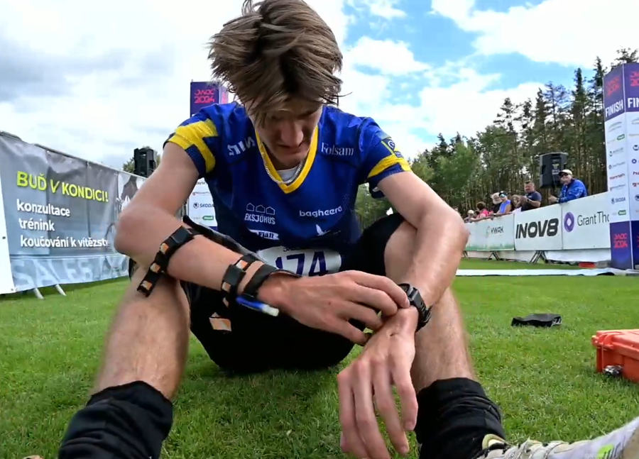 Svante Selin precis efter målgång. Foto: IOF De svenska herrarna gjorde gedigna insatser genom att alla vara topp 28 och visade att Sverige definitivt är att räkna med i toppen. Näst bästa svensk var Edvin Nilsson, Långhundra IF på en elfteplats, en minut och 54 sekunder efter vinnande Jan Strycek från Tjeckien.