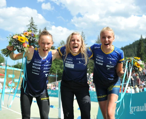 Ut på sista sträckan var det dags för giganternas kamp med Tove Alexandersson som vann medeldistansen mot Simona Aebersold som vann långdistansen. Alexandersson inleder stabilt men Aebersold plockar in några sekunder i inledningen av banan. Sedan lägger Tove in en extra växel och kan defilera i mål på en slutlig segertid av 1:47:26, 4 minuter och 28 sekunder före tvåorna Schweiz. Tillsammans sprang de tre lagkamraterna jublandes i mål och efteråt var det en otrolig glädje bland tjejerna.