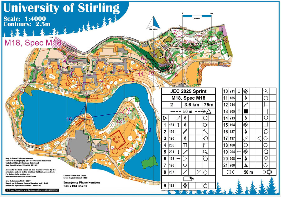 Det var en ordentligt blöt sprint som var ganska löpbetonad men som gav stora utmaningar med halka och lerigt underlag då tävlingen gick en del i park och skogsterräng vid vid Stirling University.