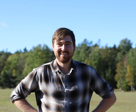 Bildtext: Joakim står vid Rudans övre ängar och pekar mot delen av ängen där arenan kommer att vara. Foto: Tilda Andersson.