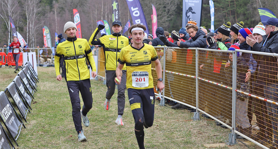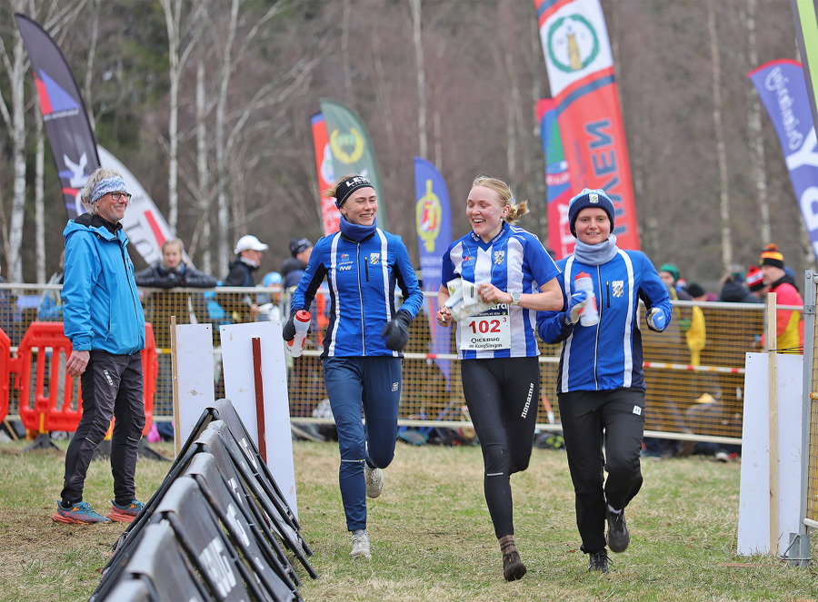 Bildtext toppbild: Topp tre i herrklassen på O-stafetten. Fr.v: Bredaryds SOK med Emil Auselius, Jonas Gustafsson och Axel Elmblad. Stora Tuna OK med Henrik Johannesson, Viktor Svensk och Joakim Svensk. IFK Göteborg lag 2 med Topias Arola, Vegard Kittilsen och Gustav Runefors. Bild: Johan Trygg.