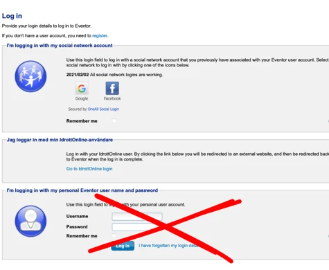 Tidigare har användare kunnat logga in med sina IdrottOnline-uppgifter genom valet "Jag loggar in med mitt personliga Eventor-användarnamn och lösenord". Denna möjlighet kommer att upphöra.För fortsatt inloggning med IdrottOnline-uppgifter, vänligen använd den nya inloggningsrutan märkt "Jag loggar in med min IdrottOnline-användare".
